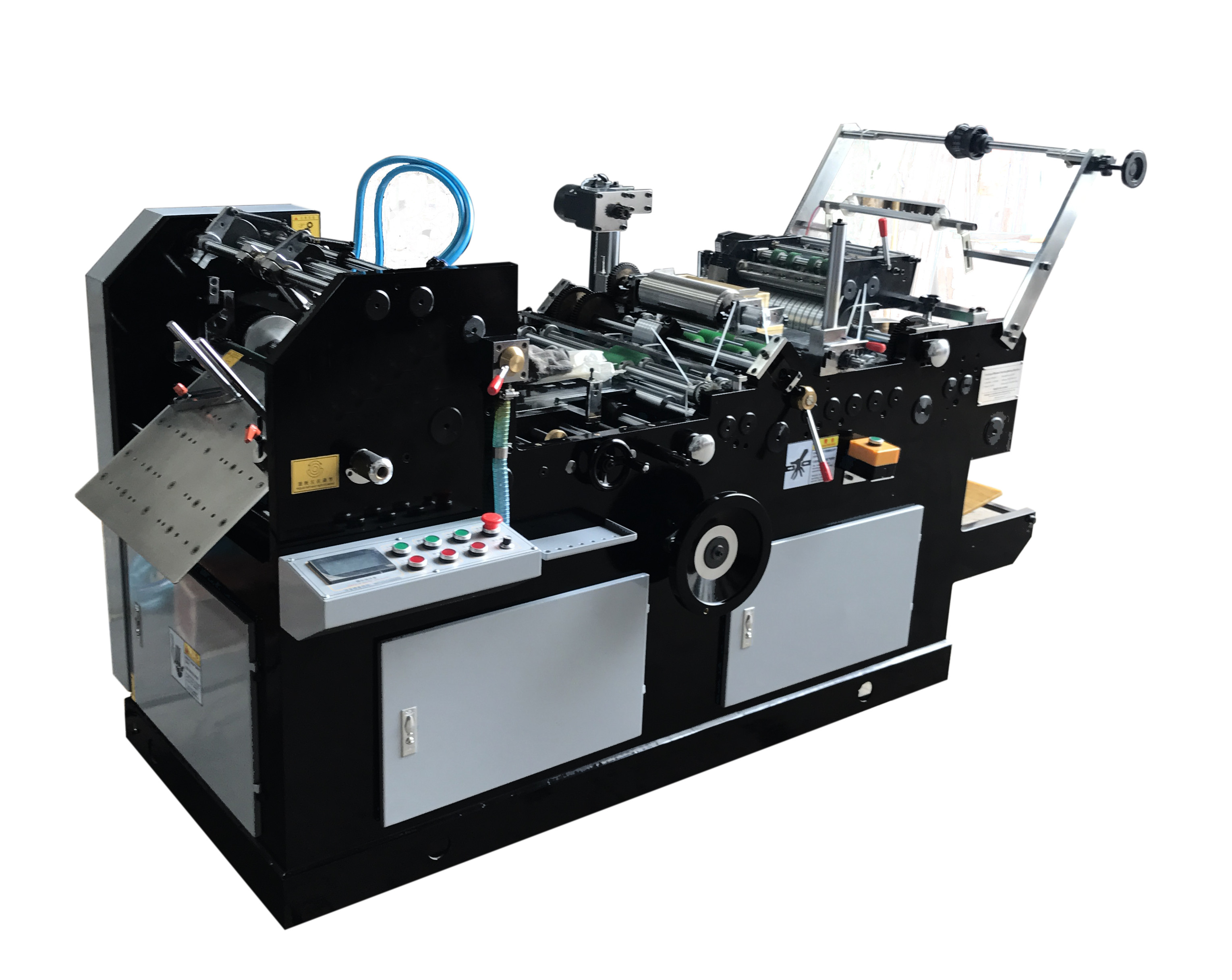 TM-220設備采用氣吸式底部抽紙,平面流水似生產,有著不停機續紙、吹氣分紙、穩定產量高、定位準確等一系列特點。上膠采用輪轉自動滾膠,保證了膠量技術參數: